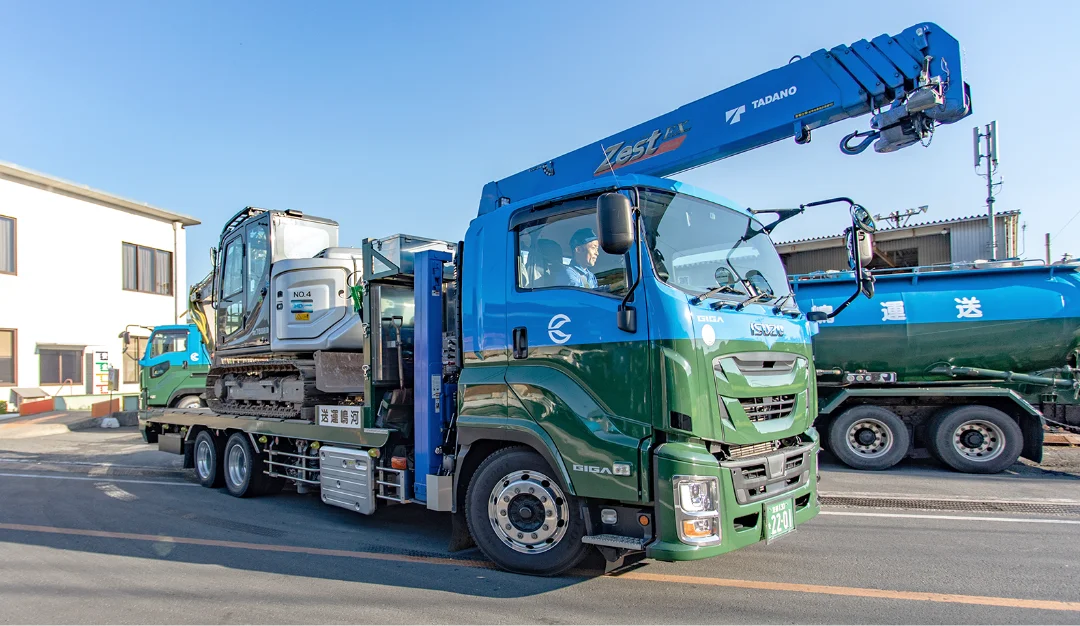 平ボディ車・台車等を用いユンボやブルドーザー、フォークリフトといった建設機械をはじめ、鉄骨・鋼材・大型設備機器などの重量物を、安全かつ確実に輸送いたします。あおりのない平ボディ車やユニック車にも対応し、建設現場や資材置場、企業間の車両移動など、様々な現場ニーズに応じた運行が可能です。